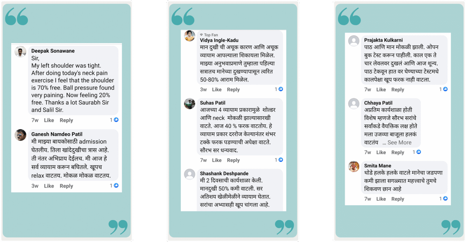 या उपचारात काही सोपे व्यायाम प्रकार आहेत जे आम्ही ऑनलाईन zoom च्या माध्यमातून live शिकवितो आणि करून घेतो.